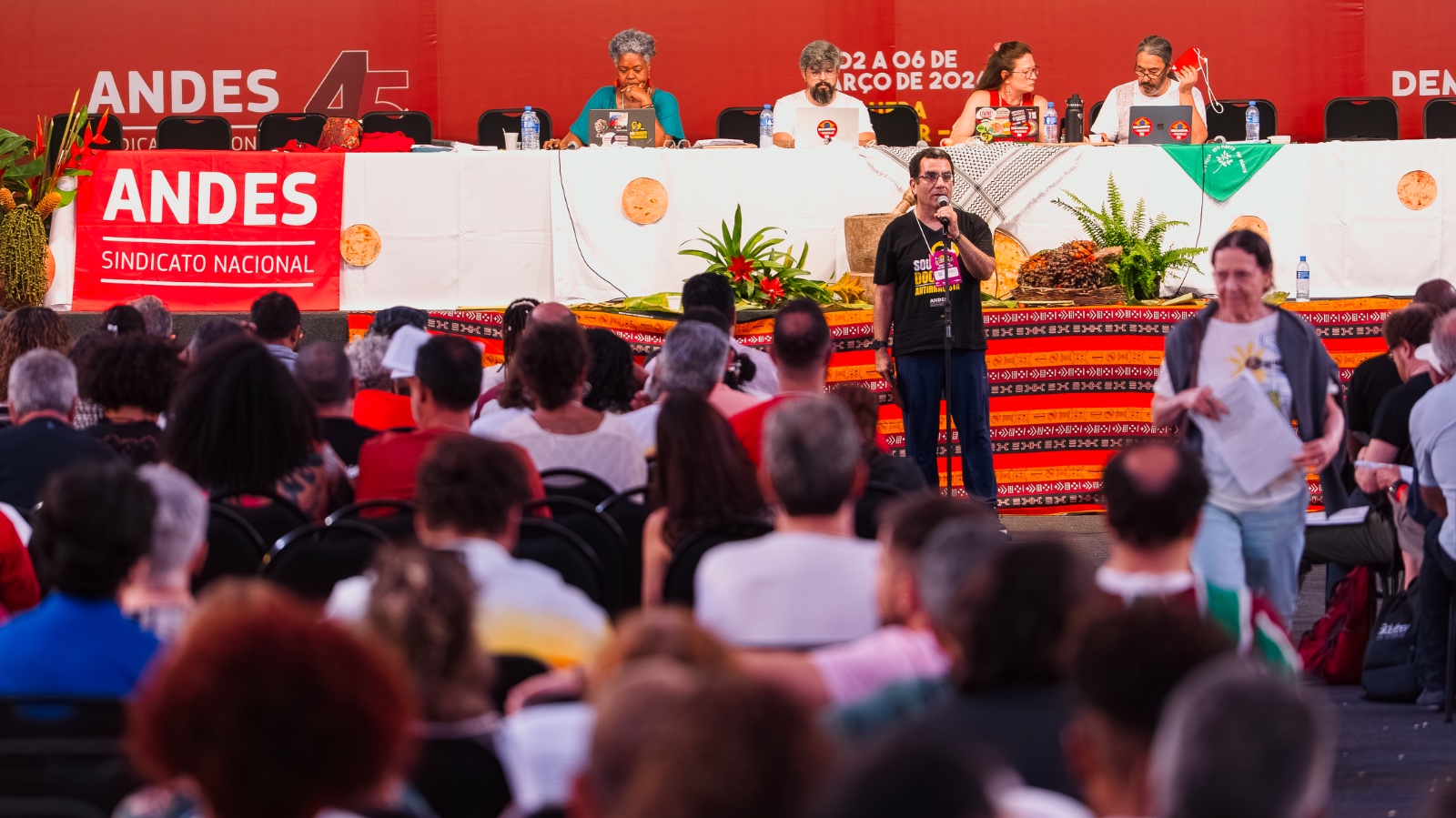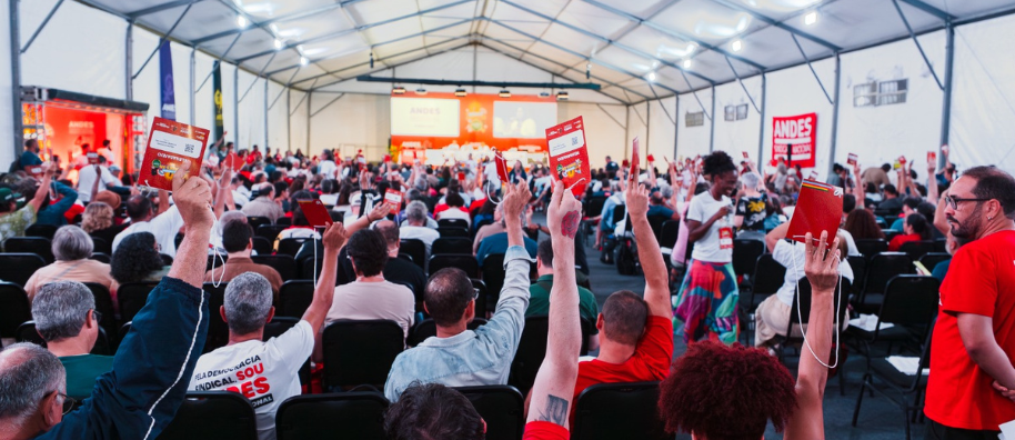 No quarto dia do 44º Congresso do ANDES-SN, realizado na Universidade Federal da Bahia (UFBA), em Salvador, as e os docentes avançaram na aprovação de resoluções do Plano Geral de Lutas, reafirmando o caráter classista e internacionalista da entidade. Na tarde desta quinta-feira (5), os debates abordaram ações estratégicas para o enfrentamento ao imperialismo, aos ataques da extrema direita à categoria docente e para a resistência contra o desmonte dos serviços públicos, entre outros.