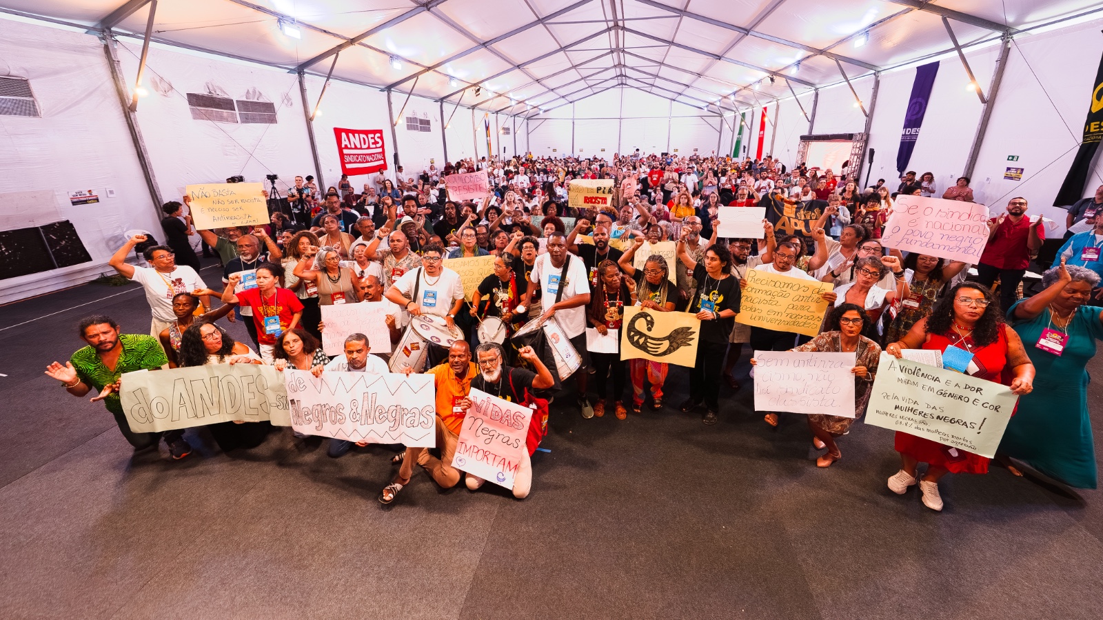 Entoando canto com refrão “contra o racismo, por reparação, contra o capitalismo somos revolução”, as professoras e os professores caminharam pelo plenário com cartazes que denunciavam o racismo institucional, mecanismos de burla do sistema de cotas e cobravam ações incisivas e permanentes por reparação e de combate a essas e outras formas de violência contra o povo negro nas instituições de ensino e nos espaços sindicais.