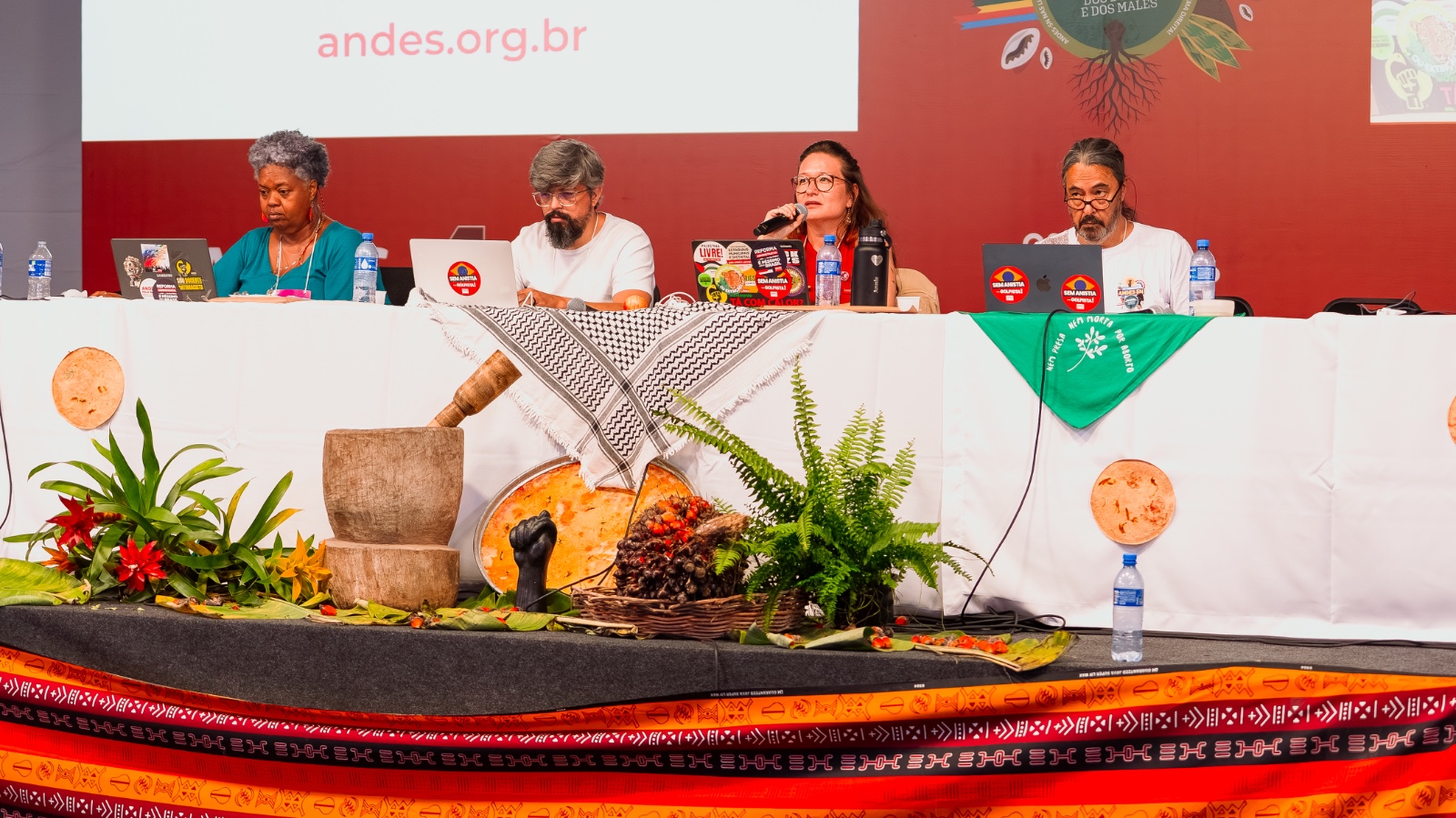 A primeira mesa sobre o Tema III - Plano Geral de Lutas está sendo presidida por Annie Hsiou, 3ª vice-presidenta do ANDES–SN, acompanhada de Marcelo Vallina, 1º vice-presidente da Regional Norte 1, Eralci Terézio, 2º vice-presidente da Regional Pantanal, e Gracinete de Souza, 2ª vice-presidenta da Regional Nordeste 3.