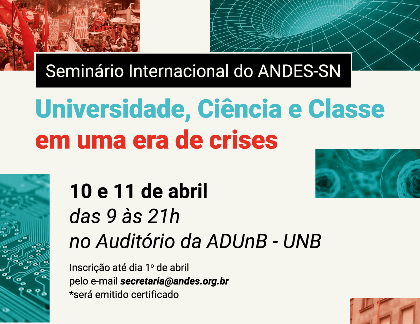 O ANDES-SN está organizando o Seminário Internacional “Universidade, Ciência e Classe em uma era de crises”. O seminário ocorrerá nos dias 10 e 11 de abril, no auditório da Associação...